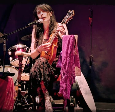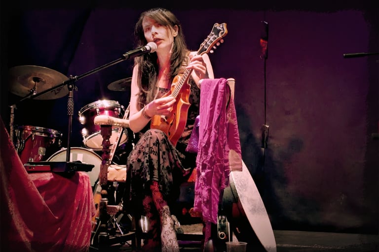 Siobhán Sarelle sitting in a chair while playing mandolin and singing on stage