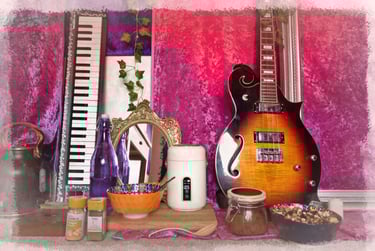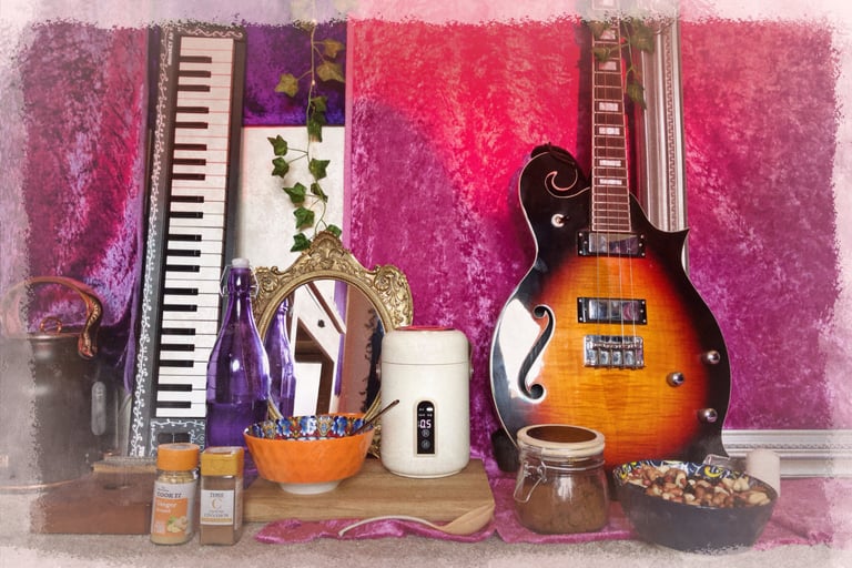 A bowl of porridge, small rice cooker, some mixed nuts, condiments, and musical instruments